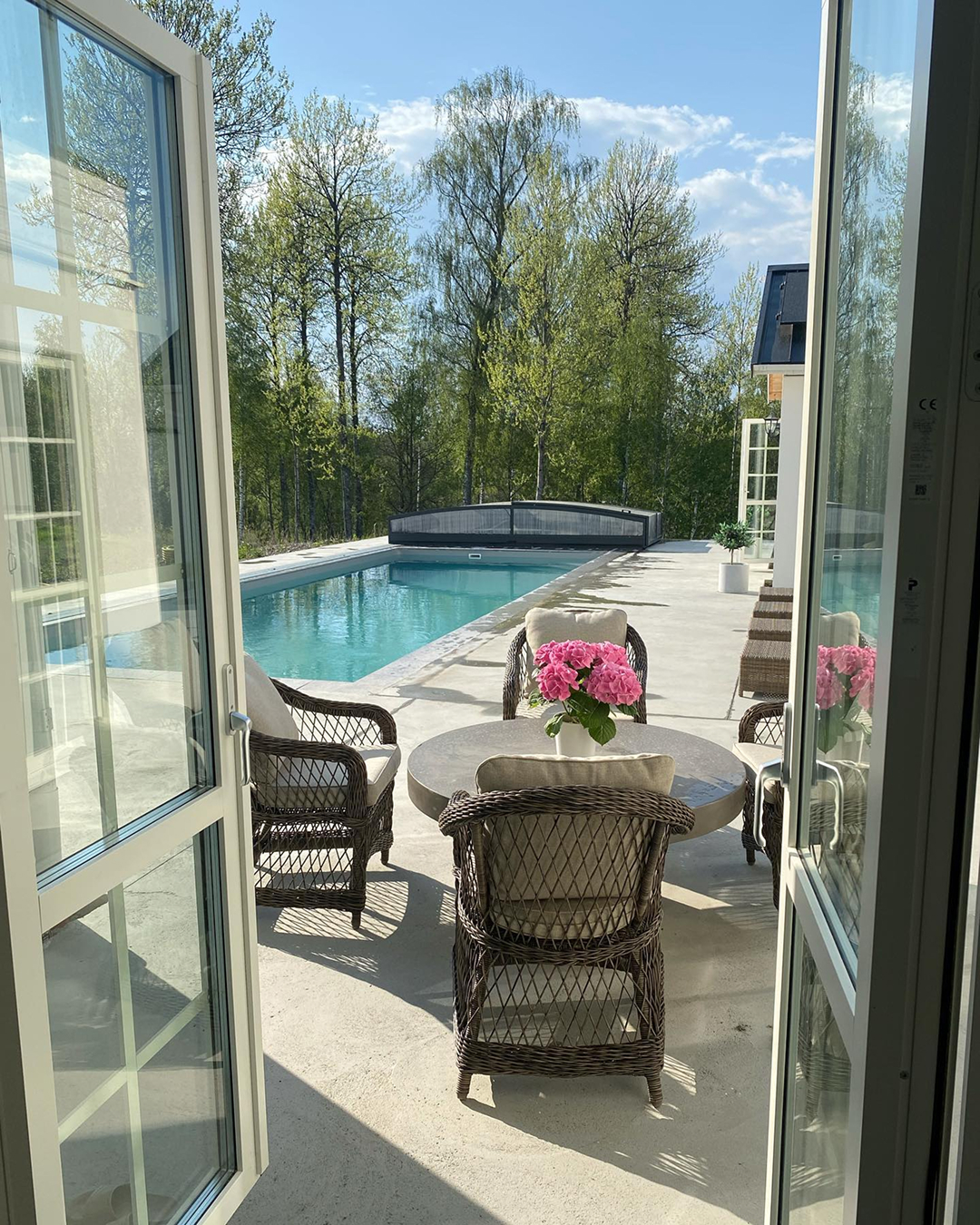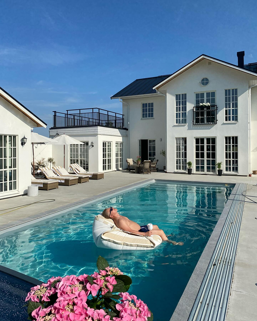– Min man ville ha en lite längre pool, och jag gillade både det estetiska och att man kan motionssimma, berättar hon. Vi är supernöjda med måttet!