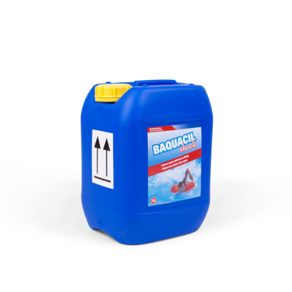 Baquacil Shock 20 liter är ett oxidationsmedel som avger aktivt syre för nedbrytning av de organiska material som de badande tillför poolen. Shock ska alltid tillsättas innan en pool tas i drift, sedan tillsätts medlet periodvis, t.ex. en gång i månaden eller efter en dag med hög badbelastning.