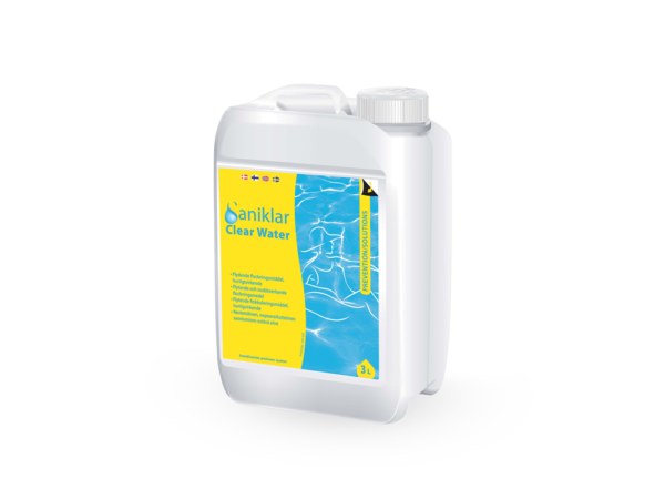 Saniklar Clear Water 3 liter är ett modernt, flytande flockningsmedel som används då man snabbt vill få ett klarare poolvatten. Clear Water samlar ihop de små svävande partiklarna som gör vattnet grått och grumligt till större partiklar som fastnar i sandfiltret.